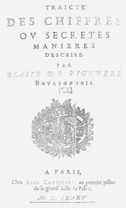 | Traicté des Chiffres |  | Blaise de VIGENÈRE 1585 (Französisch) 343 Seiten mit diversen Tafeln und Kupferstichen |
